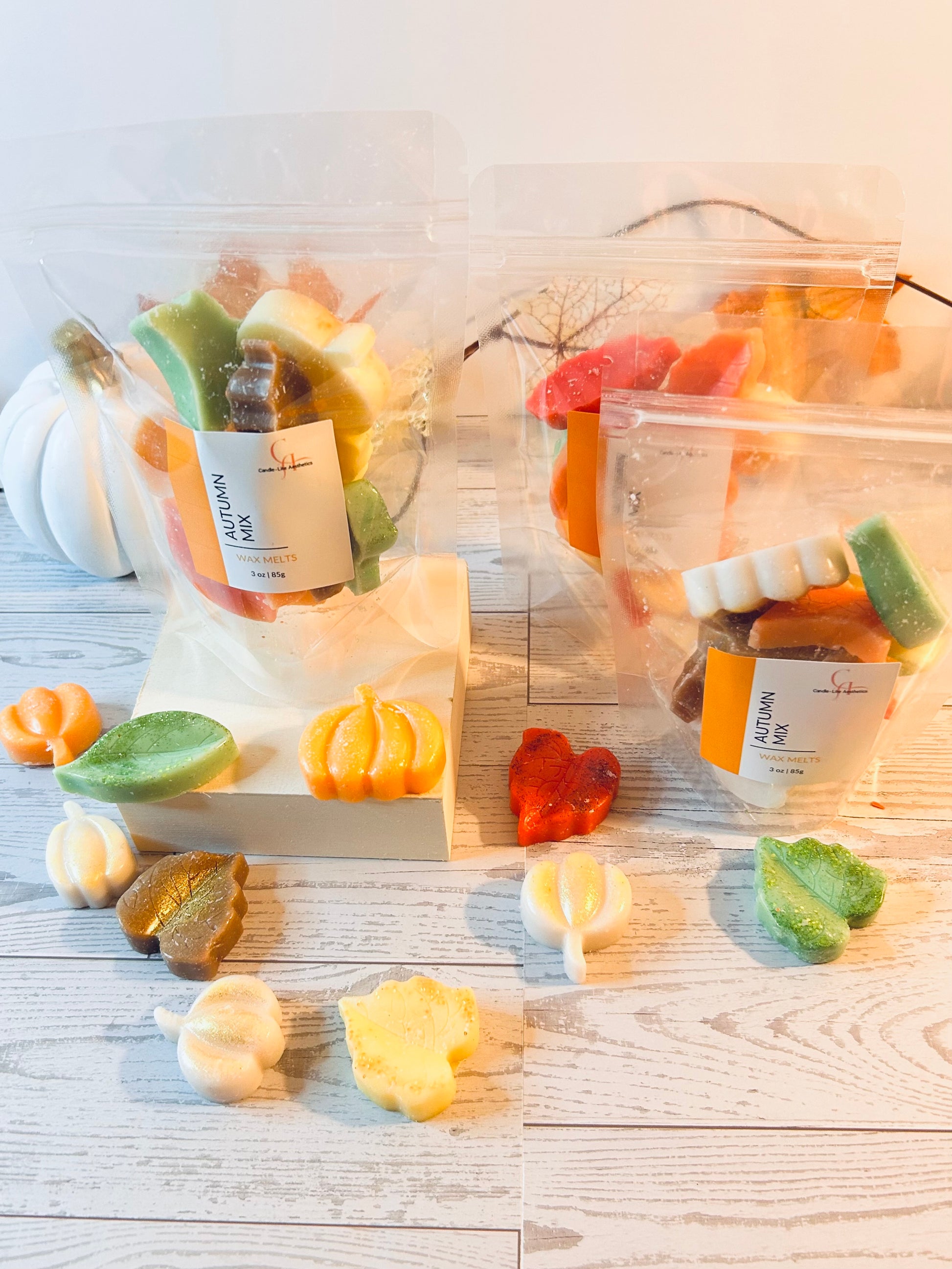Bring the heart of fall into your home with our Autumn Mix Wax Melts — a cozy blend of pumpkin, cinnamon, clove, and creamy vanilla. Each 3 oz pouch is hand-poured in small batches to capture everything you love about the season: the warmth of fresh-baked pies, the glow of golden leaves, and the comfort of sweater weather.